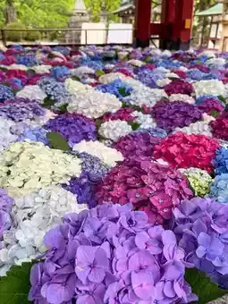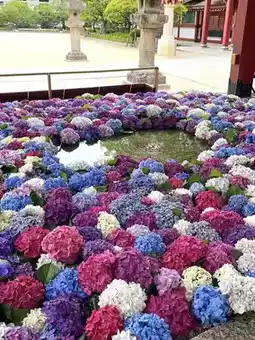 During the annual hydrangea season, the chozuya (purification fountain) is adorned with floating hydrangeas, creating a charming flower chozuya.