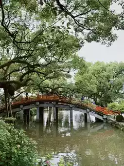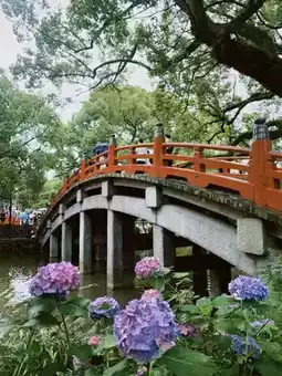 Afterward, we walked to the shrine and to Taikobashi Bridge, the red bridge that crosses the heart-shaped pond, which is another popular photo spot. When we went, the hydrangeas were in full bloom, so beautiful! (We went in July 2024.)