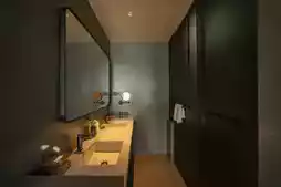 The bathroom area is thoughtfully designed, featuring a sophisticated and tranquil deep gray tone.