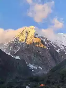 Stay up early to catch the "Sunlight on the Golden Mountain"! The first ray of sunlight on the summit of Kawagebo Peak draws gasps from everyone
