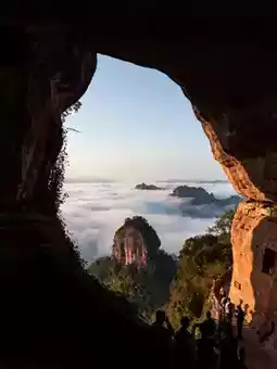 The red walls and black tiles of Taisu Palace are perfect for photos. Wearing plain Hanfu in front of the hall with the sea of clouds as a backdrop, no filter is needed for an ancient-style masterpiece. In the afternoon, pass through the natural stone cave “Little Pot Heaven,” where the view suddenly opens to a flowing immortal fantasy painting of Danxia peaks and clouds. At sunset, climb Xianglu Peak to watch the sun dye the mountains golden-red, with the sea of clouds glowing pink.