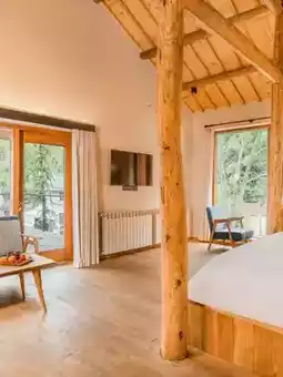 The fireplace, coffee table, and sofa in the living room are warm corners in winter.