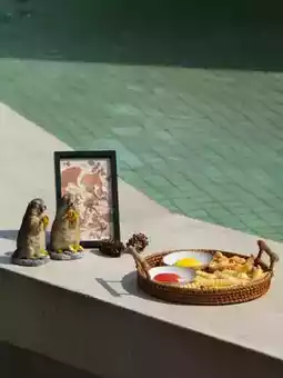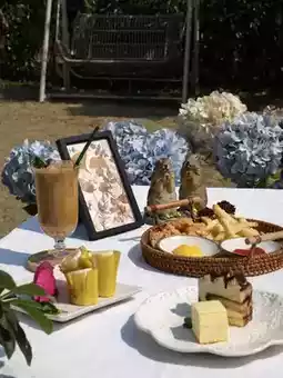 Afternoon coffee with homemade desserts, a puppy chasing butterflies.