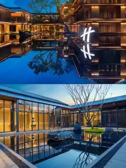 - Architecture and Design Style: The hotel consists of 11 courtyards that blend the style of Jiangnan gardens and water towns, creating a modern interpretation of a traditional Jiangnan mansion. The interior design, by HBA, follows the design concept and elements of the new generation of Holiday Inn Express hotels. Integrating the local culture of Xinshi Ancient Town, the design incorporates details such as boat-shaped and bamboo leaf-shaped chandeliers, echoing the water town and bamboo forest surroundings.