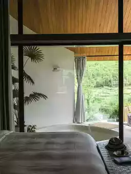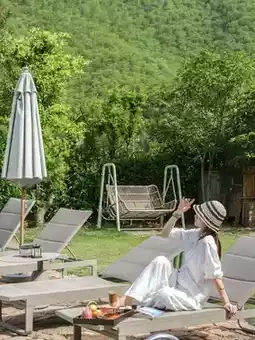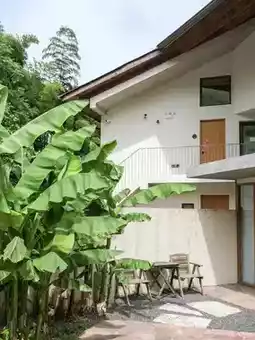 The homestay's white walls and gray tiles resemble marmot burrows nestled in the gentle slopes of the bamboo sea.