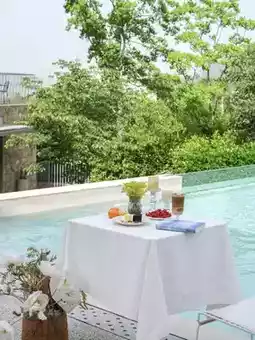 Wooden trays by the pool are filled with chilled fruits and coffee☕️.