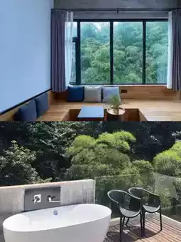 The homestay is nestled beside the 400-year-old Xicen Ancient Trail in Moganshan, surrounded by pristine natural beauty, with bamboo groves and a babbling brook.