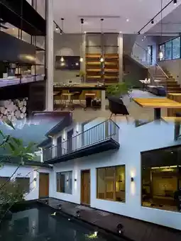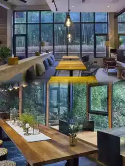 - **Architectural Design**: Comprising two buildings—Water Courtyard and Mountain Courtyard. The Water Courtyard is a two-story industrial-style structure with warm yellow lighting 💡, exuding charm. The Mountain Courtyard is a three-tiered stepped building. Both preserve Moganshan’s traditional rammed-earth walls and wooden frames while blending modern design, harmonizing with nature 🏡.