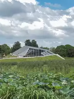 • Walk the rainbow boardwalk at dusk, the wooden path reflecting the sunset glow, by the water there is a “lake character” installation, the reflection frames the lotus fields and sky, instantly turning into a movie screenshot!