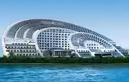 New Lake Scenic Area: Dezhou Grand Theater reflected in mirror lake, perfect for cyberpunk symmetry shots
