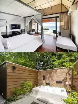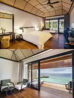The resort offers a wide variety of accommodation options, each meticulously designed to blend the natural beauty of the Maldives with modern comfort. The overwater villas are the star accommodations. As you step onto the wooden walkway leading to your villa, the crystal-clear water reveals colorful fish darting among the coral reefs, as if showing off their home. Inside, the spacious and bright interiors feature crisp white linens, soft carpets, and large windows that offer breathtaking ocean views. Imagine waking up to the first rays of sunlight filtering through the curtains. You draw them back to reveal the azure sea, with waves gently lapping against the walkway, creating a soothing melody—the perfect start to the day.
