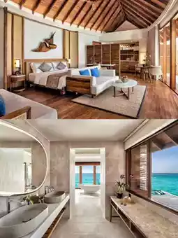 Suspended over crystal-clear lagoons and surrounded by a stunning natural island, the 40 overwater villas feature natural and soothing tones, creating a warm and natural feel.
