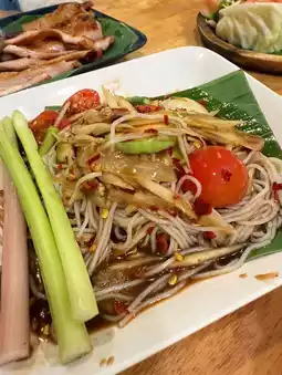 - Papaya salad with crab and fermented fish sauce: very spicy and delicious.