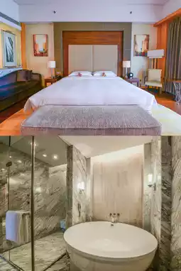The hotel has 320 stylish and elegant rooms and suites. The guest room with a lake view I stayed in this time was really great! As soon as I entered the room, I was shocked by the spacious space. The room is reasonably divided into rest, leisure, and work areas. The living room facing the door has a work desk for convenient work and a comfortable sofa leisure area, which is very suitable for quiet work or relaxing.