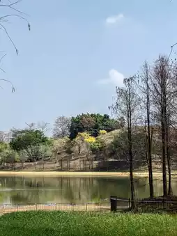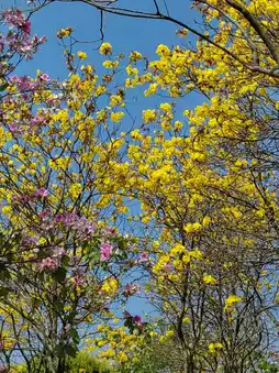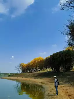 The Songshan Lake Ecological Scenic Area in Dongguan has beautiful scenery and fresh air. The yellow tabebuia trees are in full bloom, and the golden forest is crowded with visitors taking photos. The blue sky, white clouds, red kapok, yellow tabebuia, and green grass complement each other beautifully.