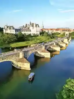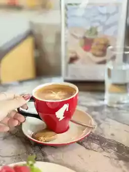Sunlight filters through the leaves, and a vintage train passes by in front of the red clock tower. It's a truly atmospheric photo op!