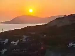 Fishermen's boats rock gently near the shore, adding poetic charm to the scene. Visitors gather along the rocky coastline or climb to the island's viewing platform, watching the sun slowly dip below the horizon where the sea seems to swallow the last rays of light.