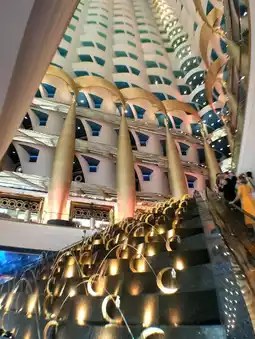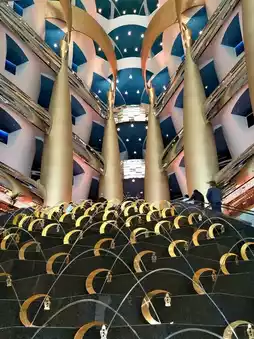 This sailing hotel is also called a seven-star hotel by many people. There is a guard booth at the entrance before entering the hotel. The guards will question the driver's purpose before letting him in. After questioning and crossing a bridge of more than 200 meters, we finally arrived at the hotel entrance. The parking space in front of the entrance was filled with many luxurious high-end brand cars. The first thing that comes into view when entering the hall is an intermittent fountain that intermittently crosses and jumps from bottom to top, which is very beautiful. There is also an extra-large aquarium fish tank next to the handrails on both sides of the fountain. When the elevator reaches the second floor, there is a flat fountain embedded in the ground. The water in the fountain falls into the hole and circulates again. The room is spacious and comfortable, and the interior decoration is magnificent and truly impeccable in quality. I'm lucky enough to have come here once in my life and I couldn't ask for anything more.