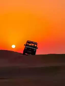 Off-road vehicles speed across the golden dunes, raising layers of fine sand. Under the afterglow, wild and free curves stretch out wantonly in the desert. This is the sunset atmosphere unique to the Dubai desert.