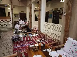 The atmosphere is absolutely amazing! There’s a real tree indoors 🌳, and the whole place is decorated in a traditional Arabic style 🏺. You’ll see a woman in an abaya making fresh bread and snacks right in front of you 🍞. There’s live Arabic music 🎶 and even complimentary henna art for female guests ✋✨. It’s a full cultural experience!