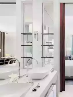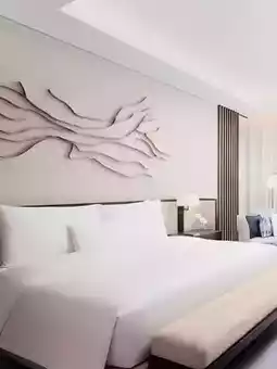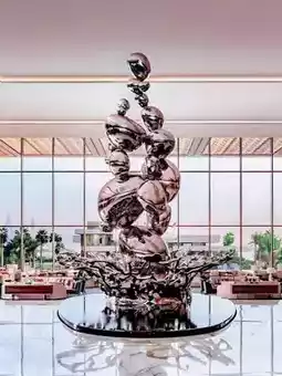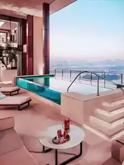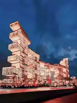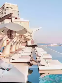 The hotel's 500-meter-long structure consists of interlocking architectural units, hailed as "a deconstruction of traditional high-rise buildings." Its 795 rooms, suites, and penthouses all offer views of Dubai's skyline and the Arabian Gulf, with some featuring private infinity pools. The property boasts over 90 swimming pools, more than 10 water features, aquariums, and fountains, including the world's largest jellyfish aquarium and the "Sky Flame" fire-and-water spectacle.