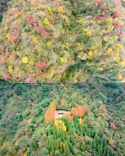 Introduction: The forest coverage rate of Zhaogong Mountain is as high as 95%. The ginkgo trees are yellow, the metasequoia trees are red, and the colorful forests are like an overturned palette, brilliant and warm.