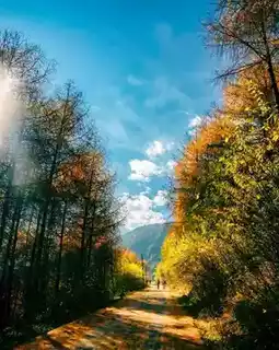 Introduction: The winding mountain road is surrounded by a large golden pine forest. The ancient Lama Temple is hidden in the mountains. The larch needles cover the entire mountain road, just like a fairy tale world.