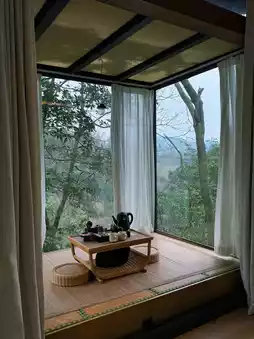 By the window, there's a tatami mat and a tea table. 🍵