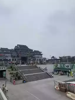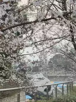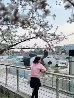 Anyone who visits this city must stop by to take a picture with this giant panda selfie. It is easy to get to, right next to the train, near the ancient bridge, and near the ancient city of Guanxian. If you come to this area, you have to walk around and visit everything. We came during spring. There were beautiful trees blooming on top. You could go up and take pictures of both flowers and pandas. The angle was just right. It was very beautiful.