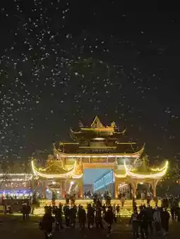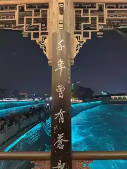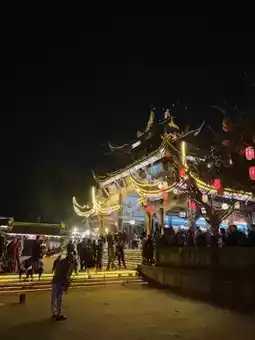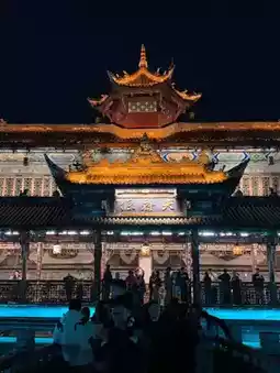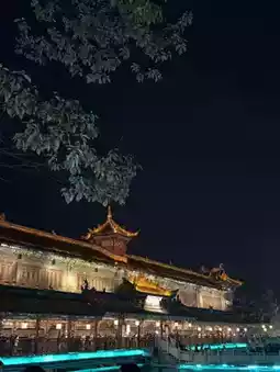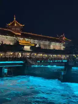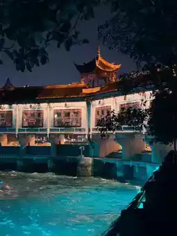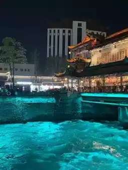 The Dujiangyan Ancient Dam is a very famous ancient dam, over 2,000 years old, the first dam in the world. It is a famous irrigation system that solves the problem of repeated flooding in the city very well. It is currently a 5A-level tourist attraction. In the early evening, blue lights are turned on, contrasting with the yellow lights on the building. Taking pictures is very beautiful.