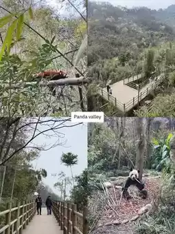We spent about 3.30 hours here at Panda Valley and we had walked around the whole place. Start by scanning and buying tickets online at the front for 55 yuan. When you get inside, there will be a path to walk up the hill. You will see many pandas. If you go in the afternoon, they will not sleep. They will eat non-stop. At the end of the path is the red panda's home. We have to go inside to see the red pandas walking up the bridge up close. On the way back down, there are souvenir shops and panda ice cream.