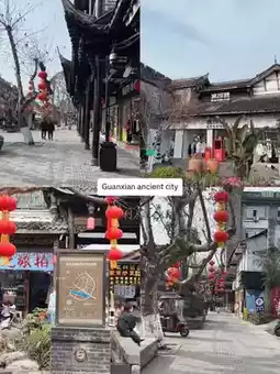 Guanxian Ancient Town At around 3:30 PM, we called Didi from Panda Valley to take us to Guanxian Ancient Town. We walked around the old buildings and found some snacks. The items were not as attractive as the walking streets in Chengdu.