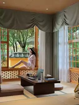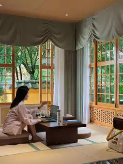 I stayed in the "Autumn Garden" private hot spring suite – spacious and serene. Waking to birdsong outside paper windows at dawn, but most magical were the evening soaks in the private onsen, gazing at emerald greenery as wind chimes tinkled, momentarily unsure whether I was in Arashiyama or Qingcheng Mountain.