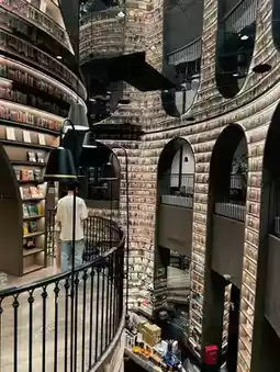 The ceiling reflects the bookshelves endlessly, making you feel like you’re walking through a never-ending library. It’s visually surreal and perfect for photography.