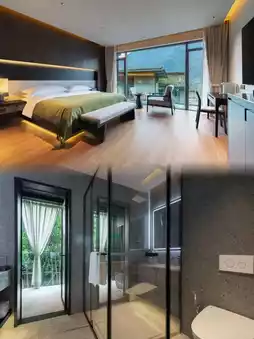 Qingcheng Mountain Shanju Fu Private Hot Spring Homestay masterfully blends modern minimalist style with Song Dynasty courtyard aesthetics. White walls and black tiles paired with floor-to-ceiling glass windows frame the entire mountain forest and sea of clouds right from your room. It’s recommended to bring a plain long robe; standing by the window will make you feel like you’re in a scene from "Crouching Tiger, Hidden Dragon."