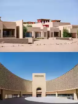 The "Monument Valley" in the desert, a highly designed secluded luxury hotel. The sunken landscape makes the whole hotel seem embedded in desert murals 🖼️, private and upscale. Rooms offer distant views of the magnificent Mingsha Mountain and Crescent Lake, excellent for sightseeing.