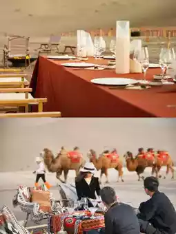 Designed like an ancient manor with stone walls and wooden corridors, dine or enjoy coffee at the Stargazing Pavilion while admiring the Singing Sand Mountains.