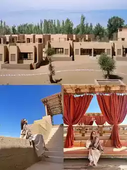 A secret desert fortress with earthy courtyards full of Northwest charm. Breakfast terrace faces the morning light of Singing Sand Mountains, evening banquets with flying apsaras dances.
