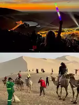 Sitting on the sand slope of Mingsha Mountain, watching the lyrics projected onto the sand with Crescent Lake in front of you! Tens of thousands of people lighting up their flashlights and singing together under the starry skyâthis experience is truly one of a kind in the whole country!