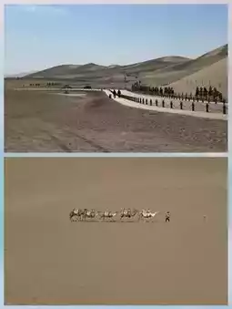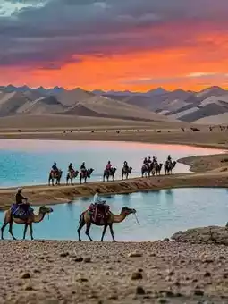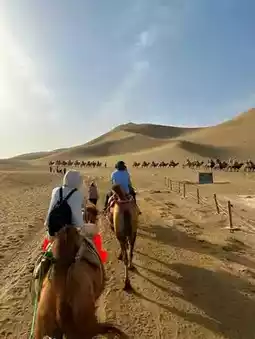 To see Crescent Moon Lake, you have to hike up the sand dunes. The journey is difficult because the sand is so, so, so fine. Fortunately, there are wooden walkways. This time, we rode camels across the dunes, from Singing Sand Mountain all the way to Crescent Moon Lake. Thousands of camels snaked up the mountain, reminiscent of an ancient caravan through the desert. At dusk, you can experience a Silk Road journey!
