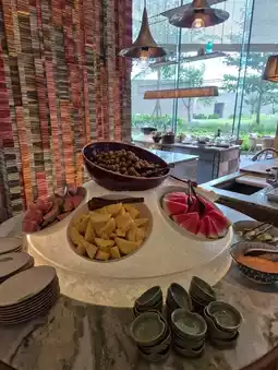 Freshly prepared mango, desserts, bread, and coffee—all satisfying and well-curated