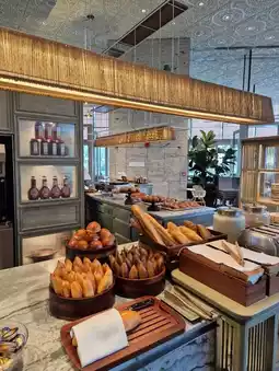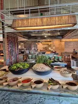 A refined Vietnamese breakfast buffet enjoyed in a spacious and relaxed setting.