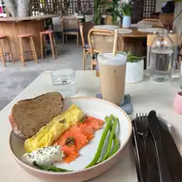This cafe looks very cute and there is good cooling inside. The food tastes good and fresh, especially the pastries are worth a try! The sandwich and the eggs were awesome, I can recommend it. we had the chicken pesto sandwich and that was delicious.