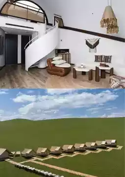 • Architectural Design: Comprising a starry sky service center island and nine starry sky guest rooms, each equipped with a stargazing bedroom, a large-view living room, a bathroom, and a shower. Outdoor spaces feature curved terraces. The service center island includes a central circular lounge area, service zone, and bar counter, with a hexagonal design offering 360° panoramic views.