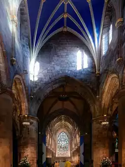 The most striking feature of its exterior is the crown-shaped spire, which exudes grandeur even from afar. Inside, the spacious area is adorned with intricate stained glass windows, stone columns, and vaulted ceilings. A particularly unique feature is the "Thistle Chapel," reserved for members of Scotland's highest knightly order. Though small, it showcases exquisite carvings, with a ceiling featuring golden thistle motifs symbolizing Scotland.