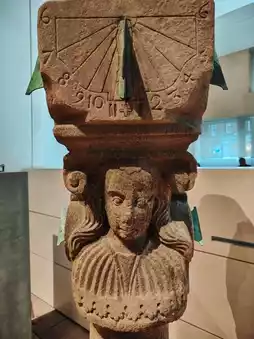 The sundial on display is a robust piece—crafted from stone and metal, with a weathered patina that speaks of centuries past. Its surface is etched with precise markings, some denoting hours, others months, depending on the design. You can see the care in its geometry: the angle of the gnomon (the shadow-casting arm), the curvature of the dial, and the alignment that once mirrored the sun’s path.