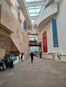 From the top floor, the view is breathtaking. The ground floor stretches below in elegant symmetry, framed by slender columns and arched windows that let daylight pour in like a blessing. Visitors drift across the polished floor like figures in a living painting—small, curious, and gently illuminated.