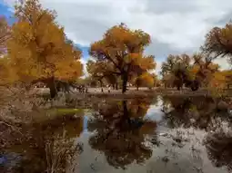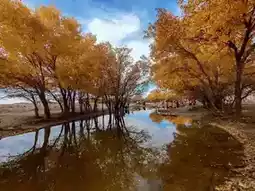 Walking deeper along the wooden boardwalk, the ground is covered with scattered golden fallen leaves that rustle underfoot. Looking up, sunlight filters through the branches of the Populus euphratica, illuminating the leaves with a translucent glow. When the wind blows, golden leaves flutter down like an endless "golden rain," and you can catch a handful of gentle warmth. The most stunning sight is the water mirror Populus euphratica at Erdaoqiao, where the clear lake surface reflects the golden canopy, with distant sand dunes serving as a backdrop. Standing by the lake and snapping a photo, people and scenery blend into the shimmering waves, making it hard to tell reality from a painting.