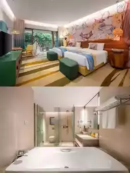 We booked a family room with two double beds and super cozy decor. The kids were jumping for joy as soon as they entered! Each room has a small balcony and a bathtub, plus complimentary welcome fruit 🍎, milk and drinks in the fridge – attention to detail is top-notch! After a dip in the hot springs, the kids couldn't resist another soak in the bathtub – they had a blast!