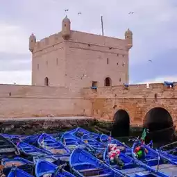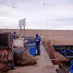 The port of Essaouira is alive with color, movement, and history. Bright blue fishing boats bob gently in the harbor while seagulls wheel overhead, calling out as nets are mended and the smell of fresh fish fills the air. 🐟🌊